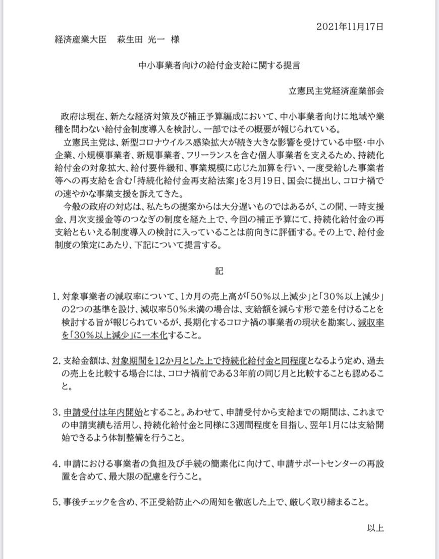 経済産業部会長として、この予算の実現とともに、充実した支援をするために、要件となる売上減収要件はコロナ前と比較し30%減以上の事業者とすべきこと、あわせて支給額も充実させるべきこと、そして何より早く支給開始をするべきことなどの提言をまとめ、17日、経済産業省に対しあらためて申し入れをしました。
